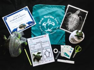 Be a Vet! Kit Includes: Sea turtle toy altered for program activities, Sea Turtle, Inc. Drawstring Backpack & Pencil, New Patient Intake Form, Sea Turtle X-Ray, Scale, Tape Measure, Scissors, Medical Tape, Syringe, Gauze, Patient Release Certificate.