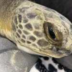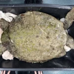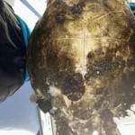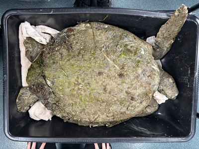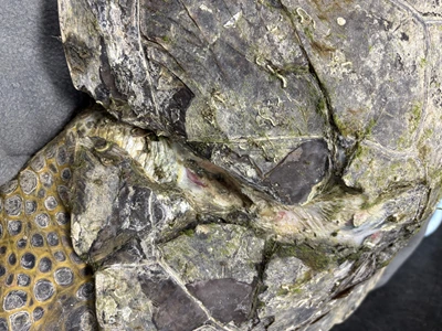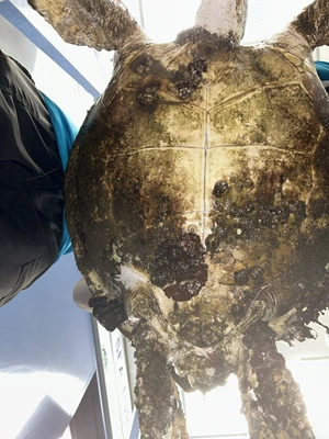 Severe boat strike wound to the caudal carapace (recent but not fresh).
