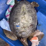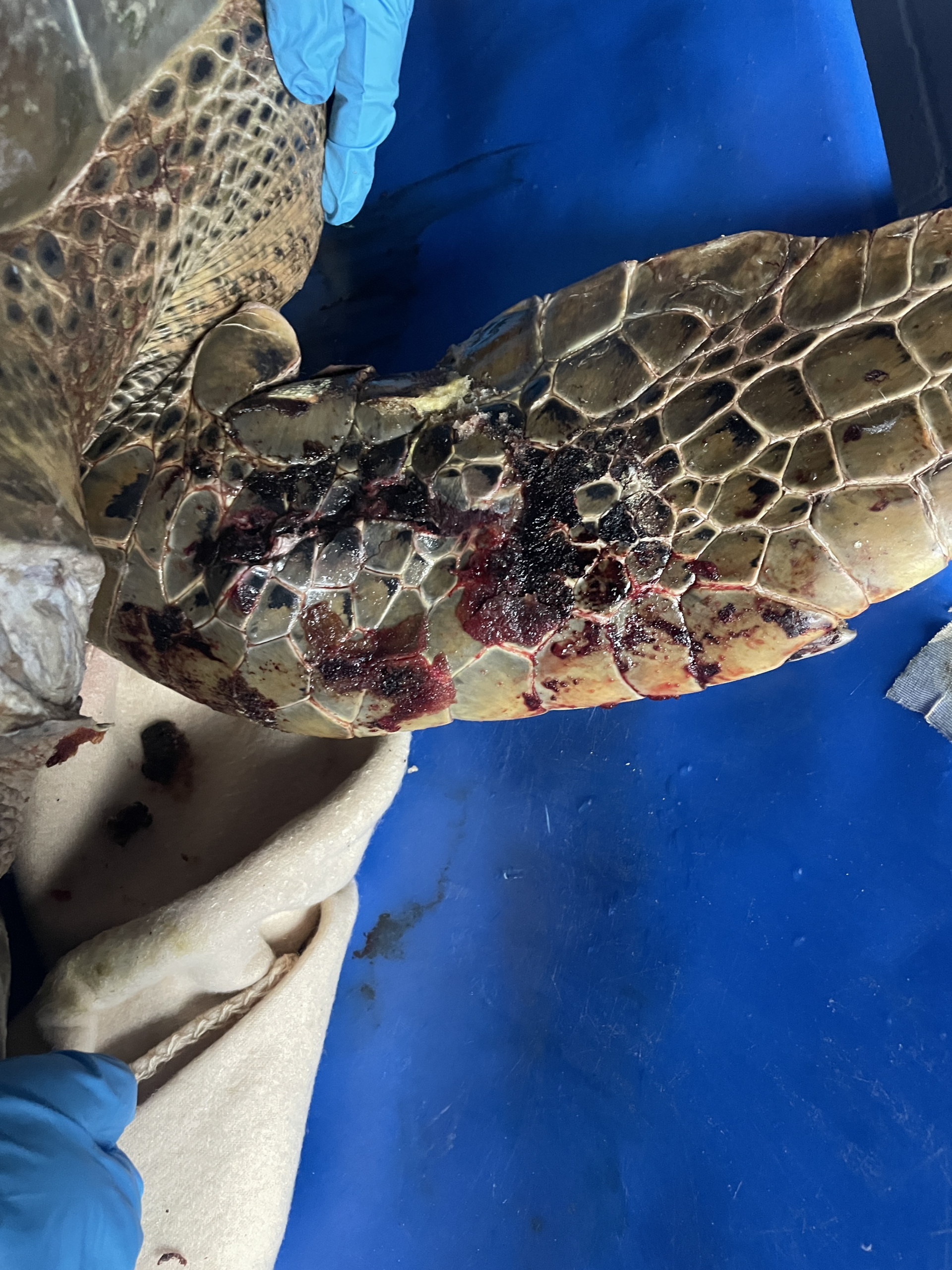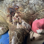 Sea turtle arrived with severe injuries on the front left flipper and around the neck. Patient is receiving care and continuing to recover in our clinic.