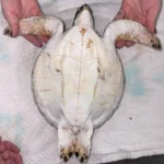 Moderate abrasions on carapace, plastron, and rear flippers. Abrasions on both front flippers. Abrasions above left eye and on chin.