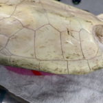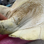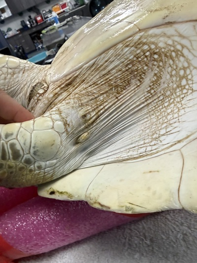 Small abrasions on plastron, possible tumors on shoulders and rear flippers