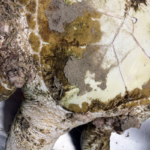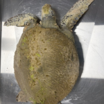 FP Tumor Grade 2/3, with tumors on eyes, head, neck, flippers, soft tissue, and side of plastron. Notch broken, white lesions on RRF and in/on notch wound. Parallel, shallow curved cuts on lower left plastron.