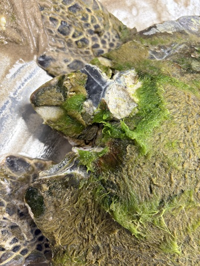 FP Tumor Grade 2/3, with tumors on eyes, head, neck, flippers, soft tissue, and side of plastron. Notch broken, white lesions on RRF and in/on notch wound. Parallel, shallow curved cuts on lower left plastron.