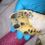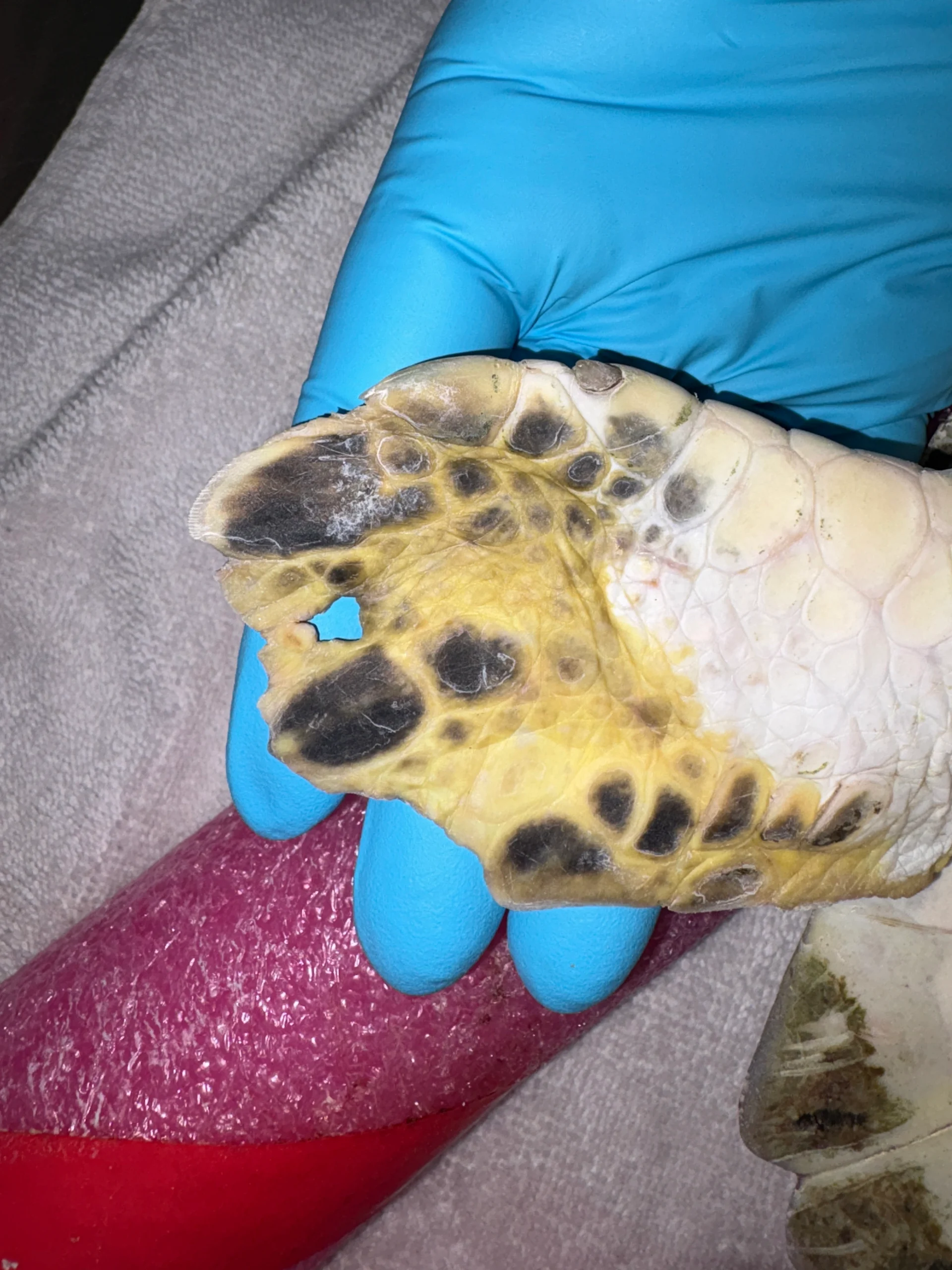 Head/Flippers/Soft Tissue: abrasions to underside of right front flipper, abrasion to right side of head, hole in right rear flipper