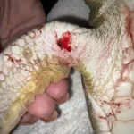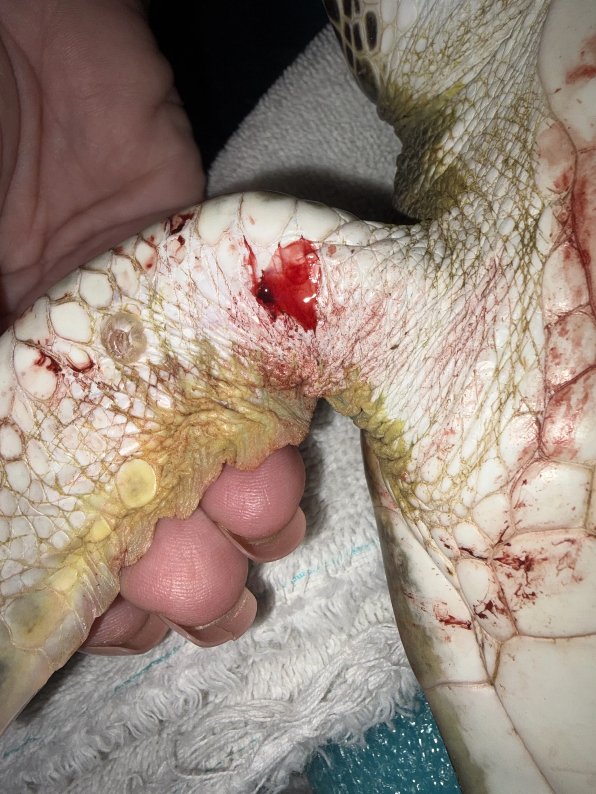 Head/Flippers/Soft Tissue: One small notch out of the right front flipper, small abrasion on the rear left flipper, small cut around nail of right rear flipper