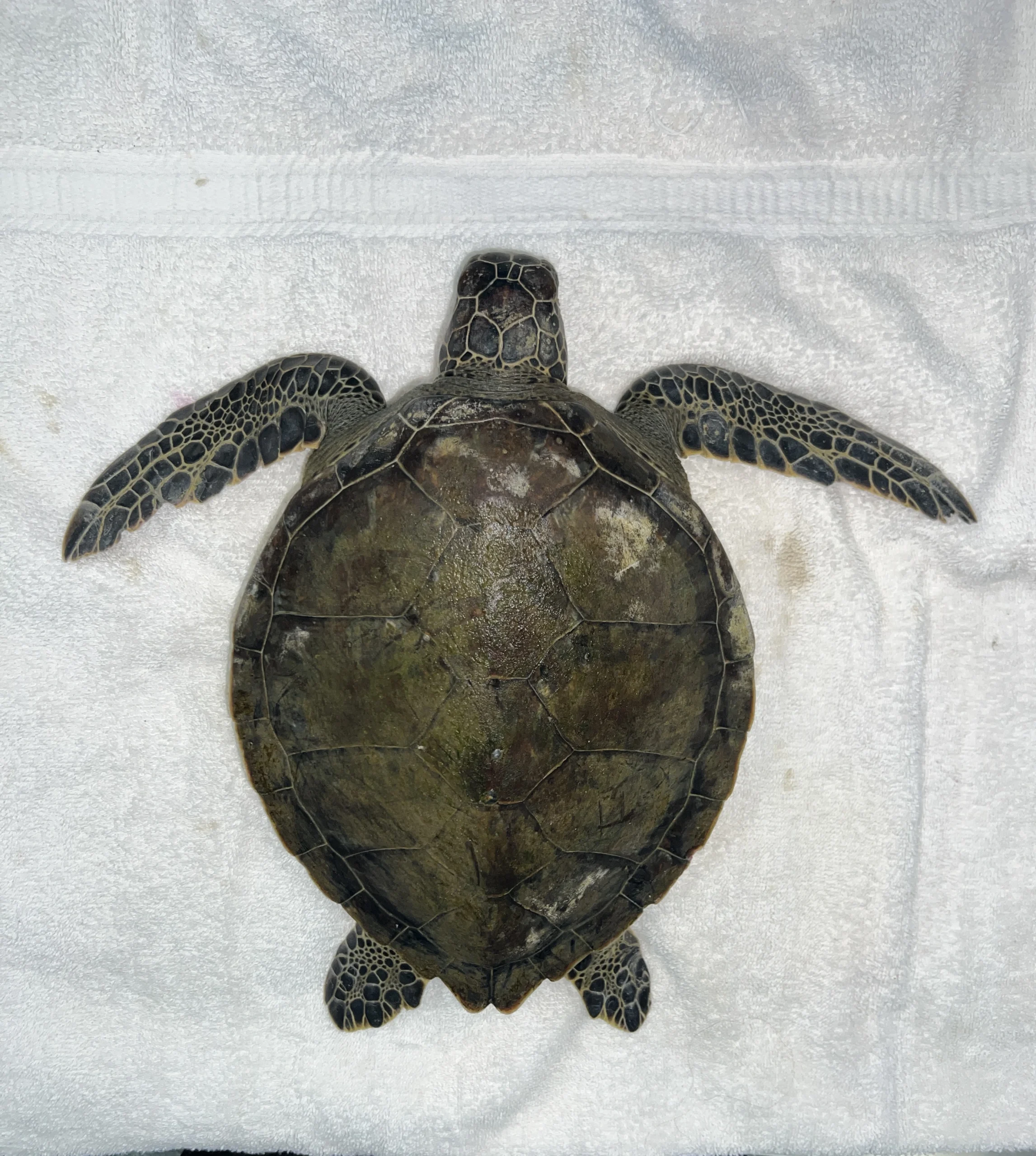 Hook wound to the left side of the mouth, minor plastron and carapace abrasions, missing portions of right rear flipper, and missing some notches out of the front flippers.