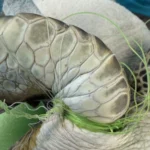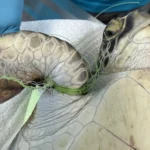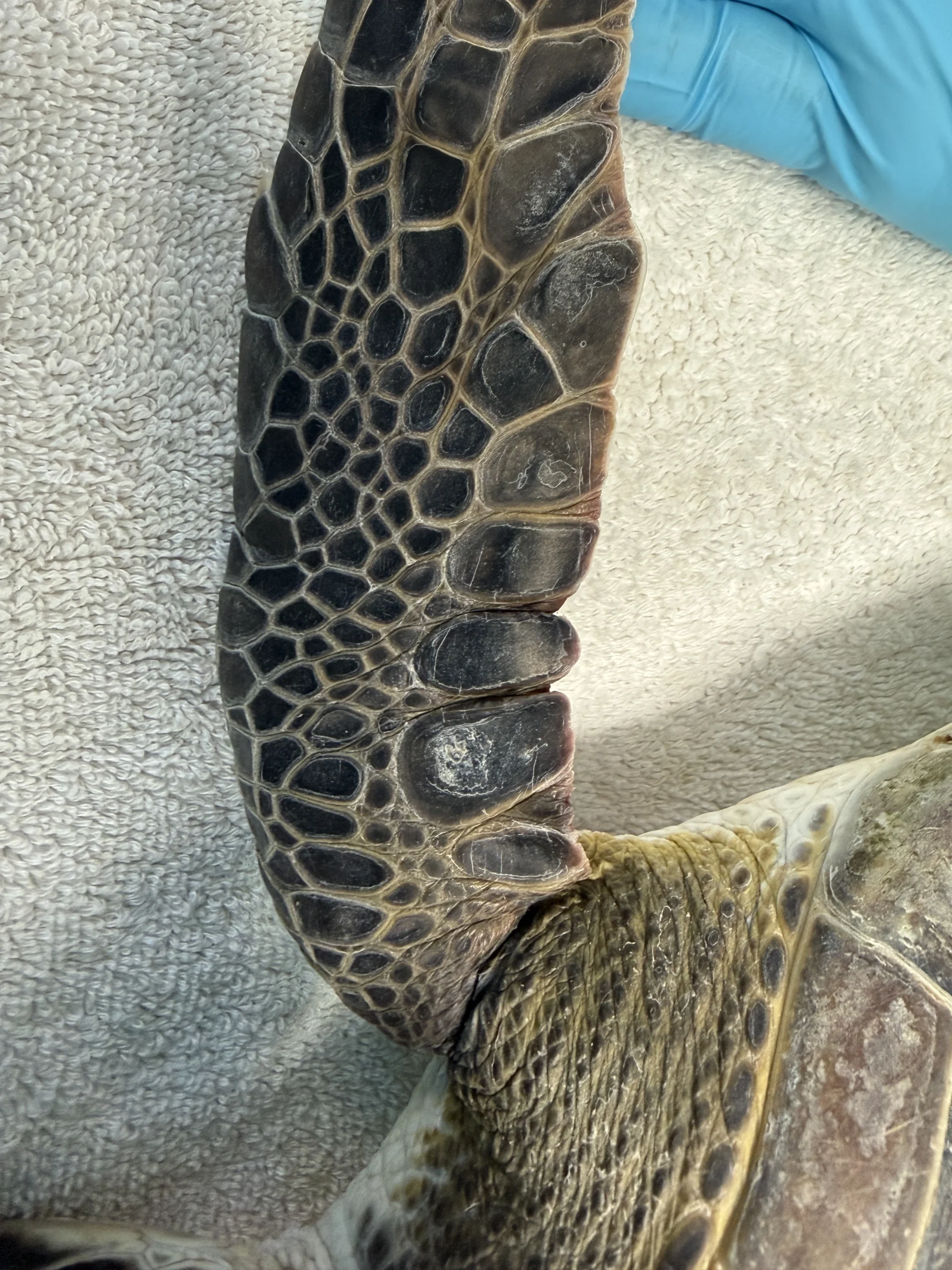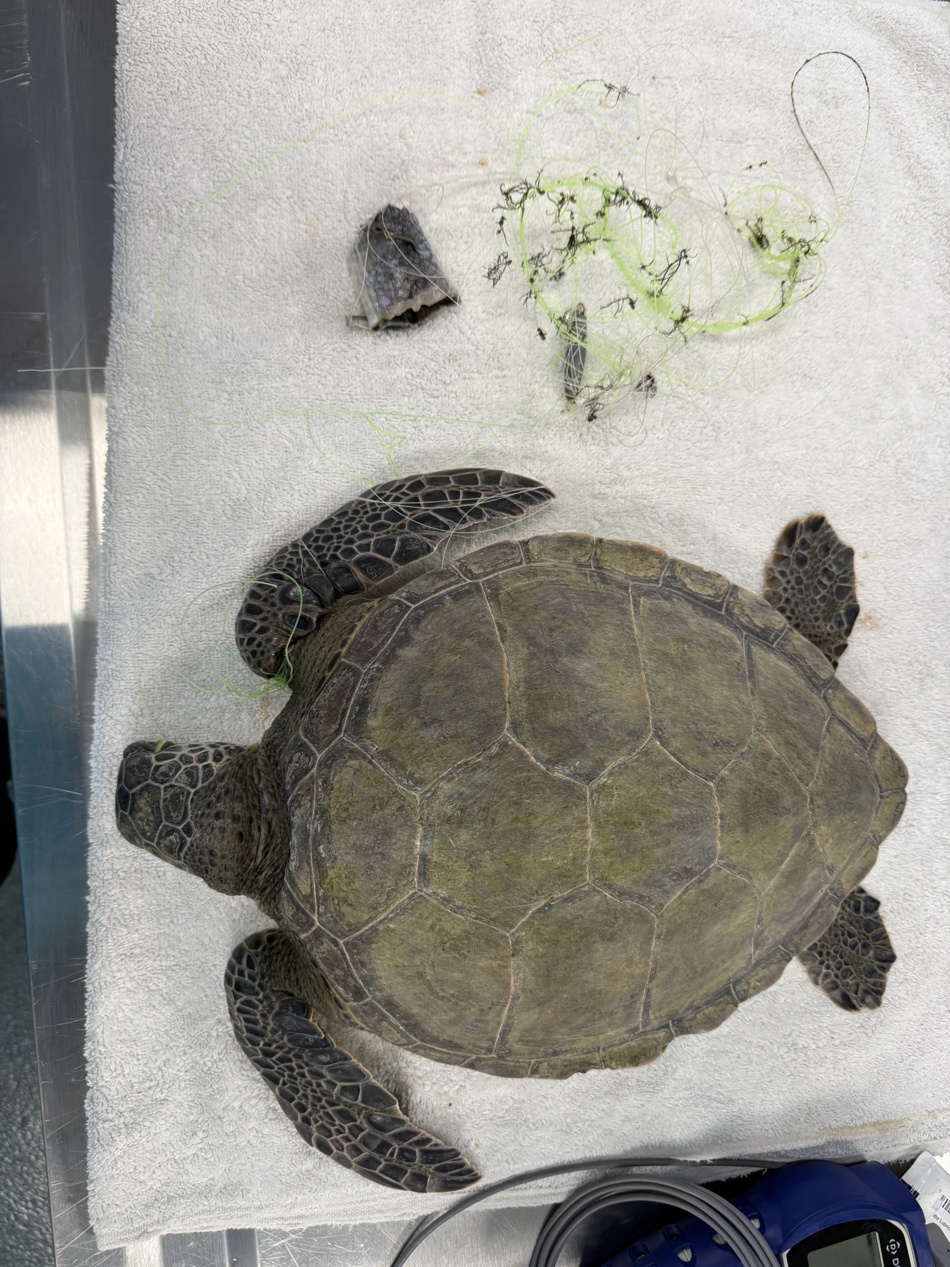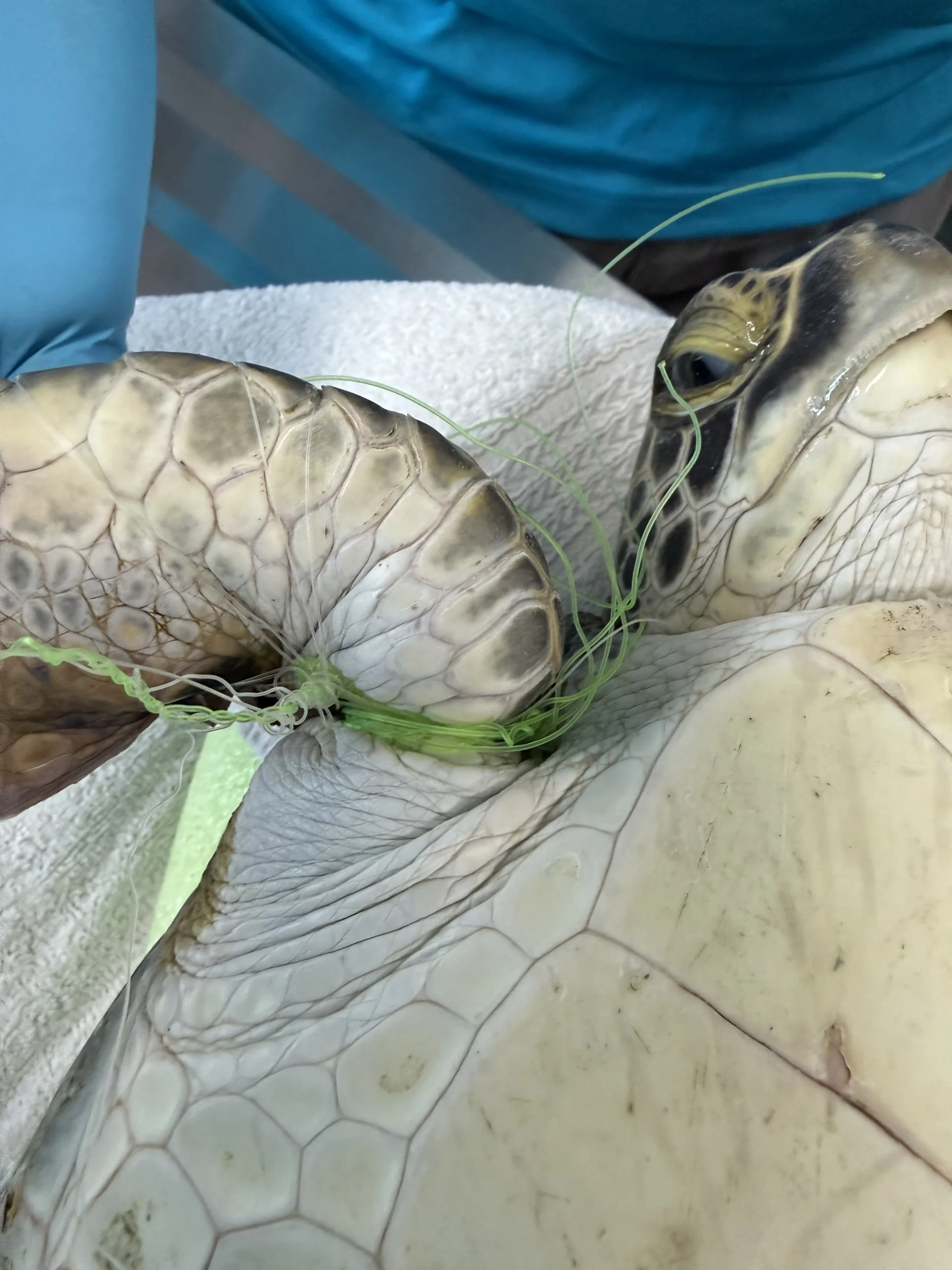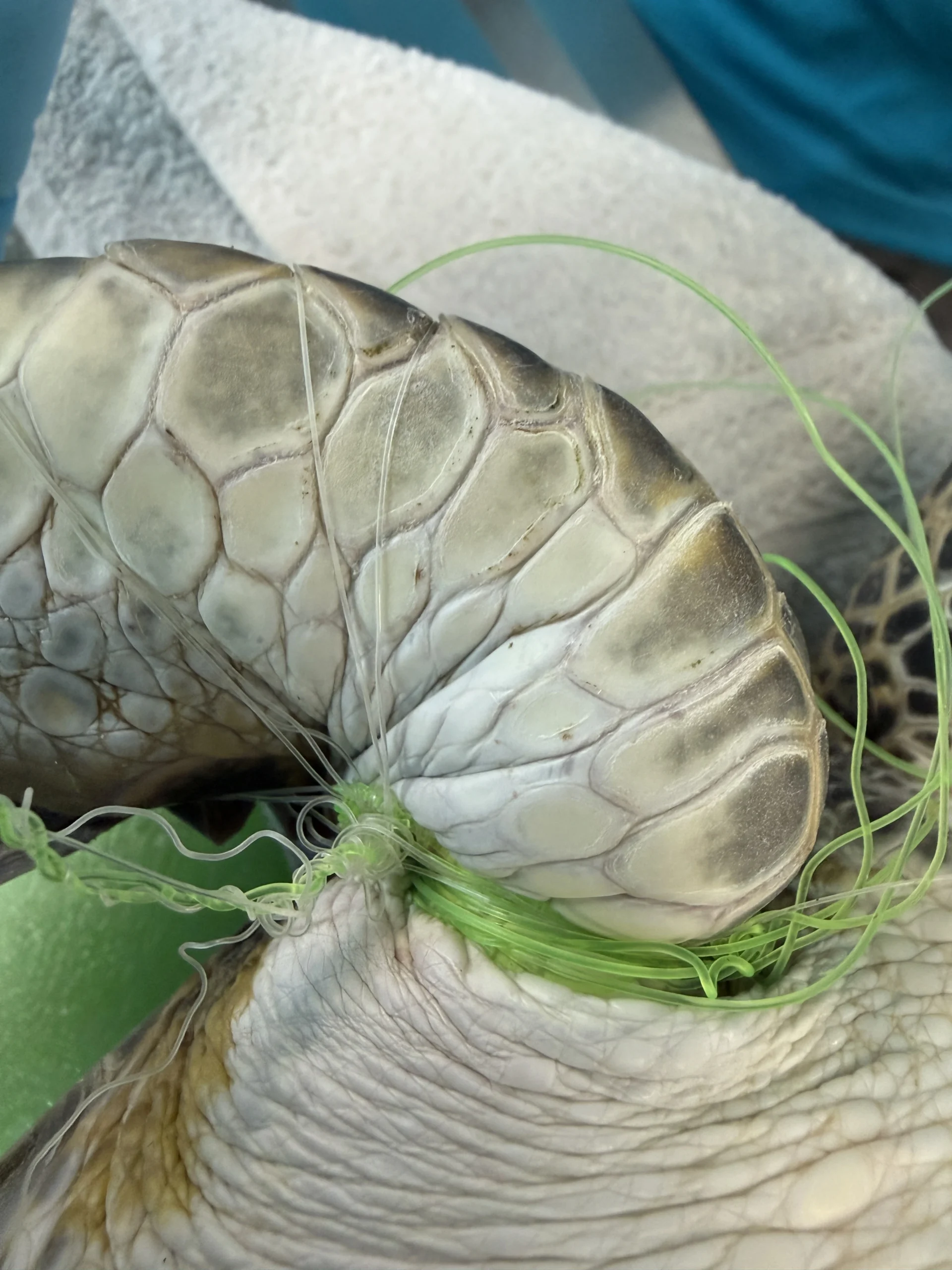 External Wounds: Monofilament line wrapped tightly around the right front flipper and head. Both clear and green line.