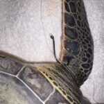Fishing line wrapped around Left Front Flipper and into mouth (no internal hook). Small hook wound to left shoulder. Small notch out of left marginal scutes but already healing.