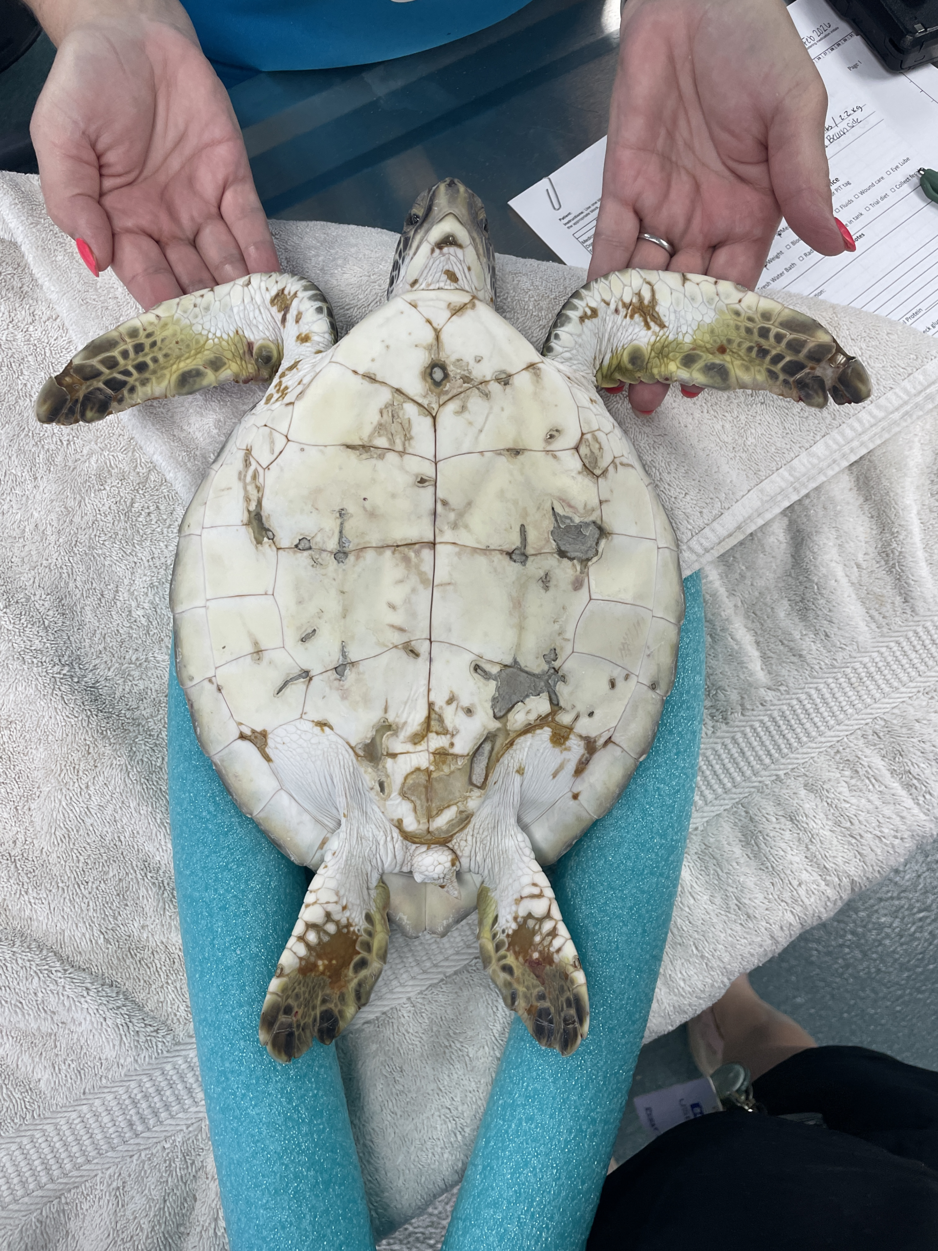 Moderate abrasions on carapace and flippers, severe abrasions on plastron, strange pink in both eyes