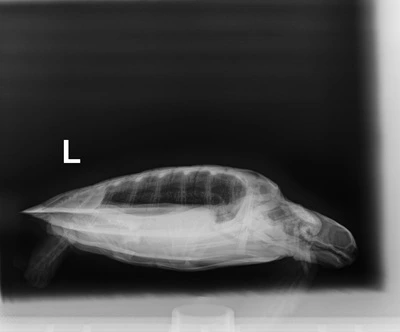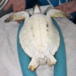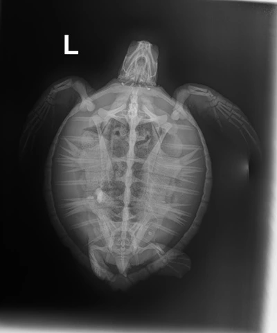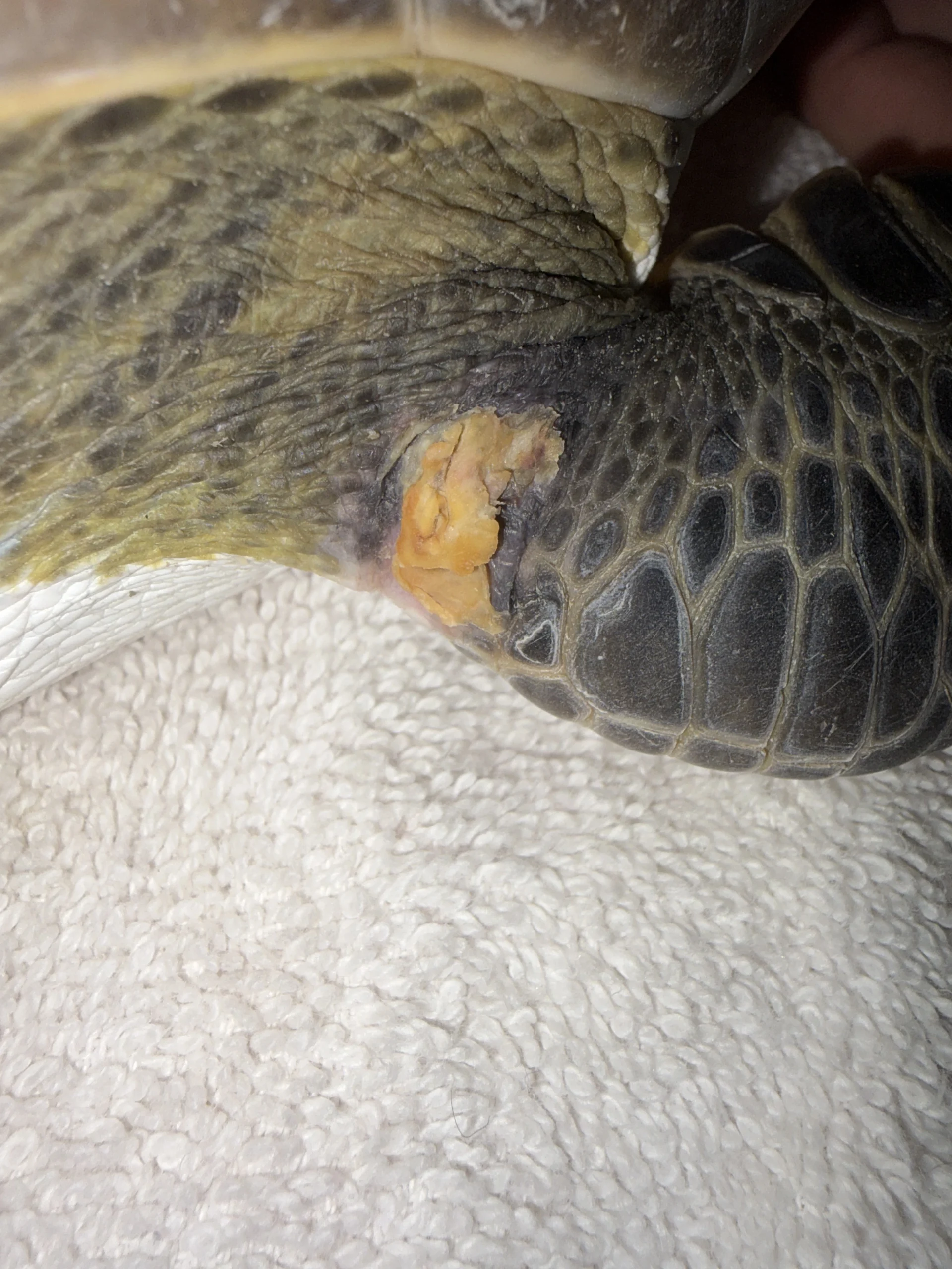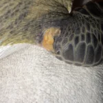 External Wounds: Healed wound on the shoulder of the left front flipper with exudate on it. Small abrasion the ventral side of the left front flipper. Minor abrasions on the belly and shell.