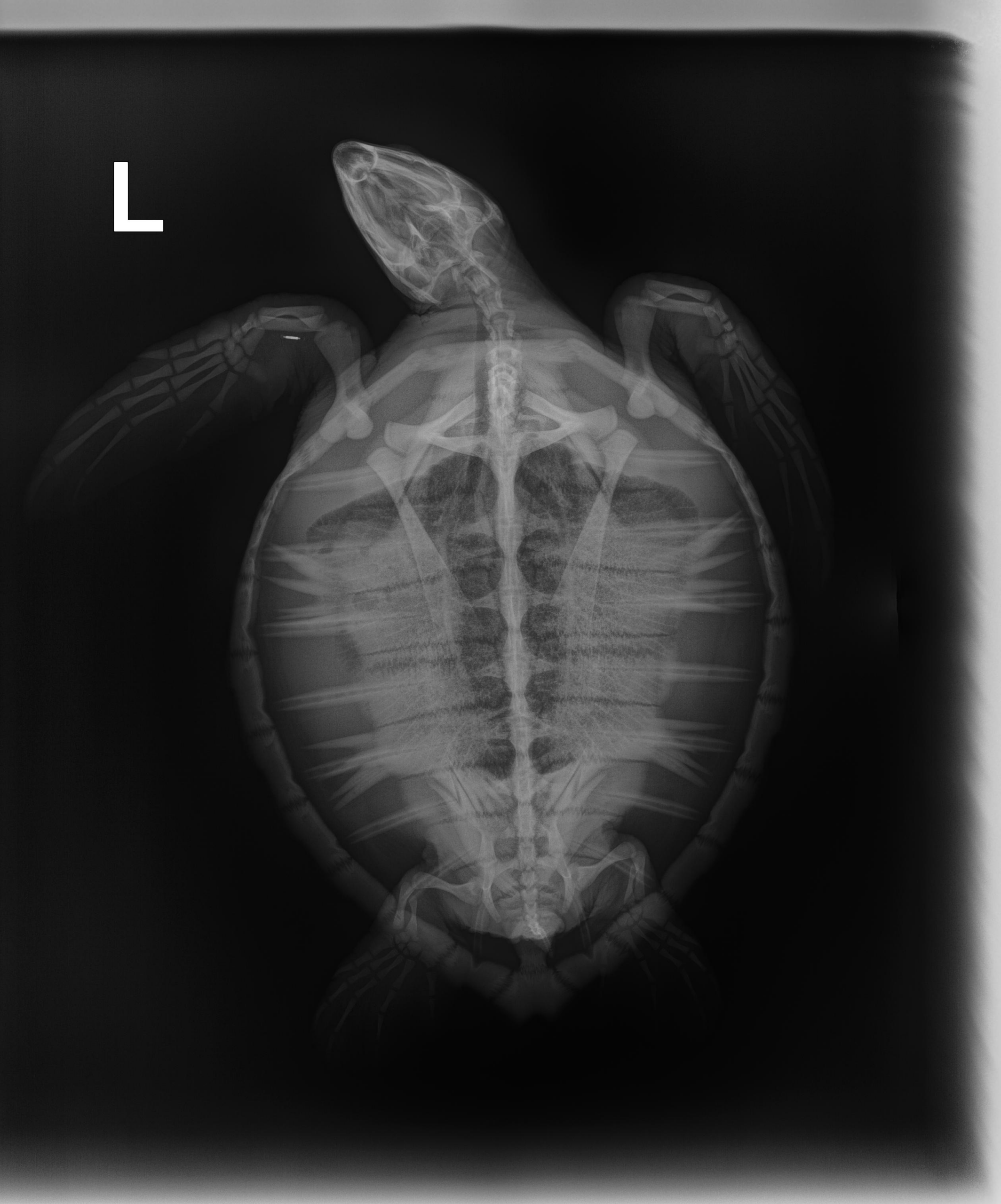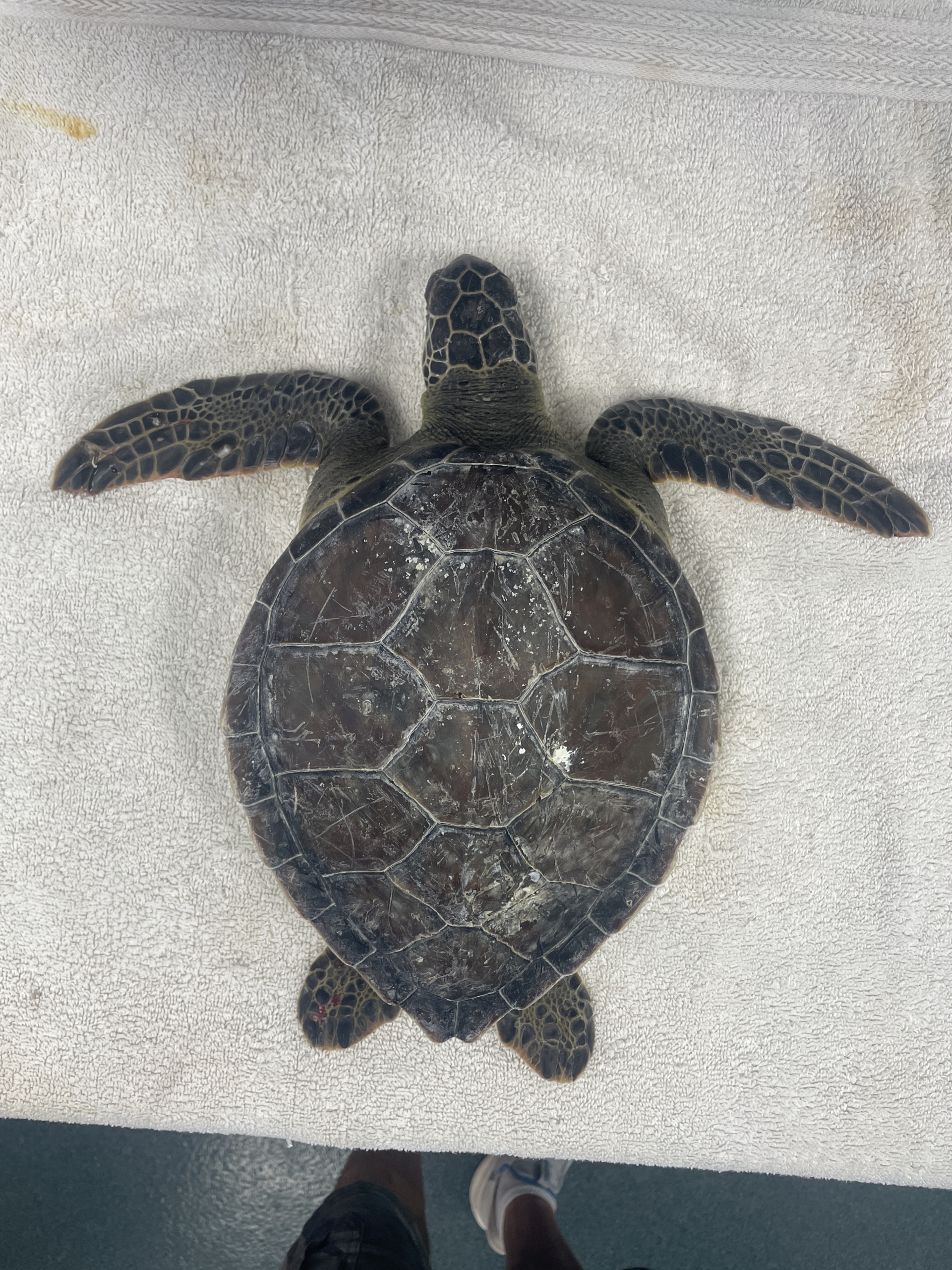 Minor abrasion on carapace, moderate abrasions and bruising on plastron, on LFF 2 oozing abrasions and 1 bleeding, 1 bleeding abrasion on right, front flipper. Had a pit tag (can see in dv radiograph).