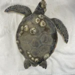 Notches on rear flippers, abrasions on right front flipper, minor abrasions on plastron, abrasion under barnacle on head