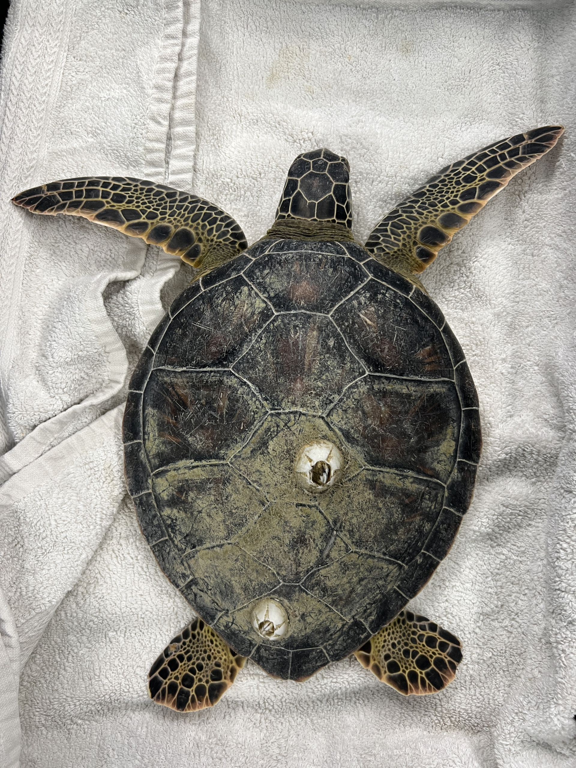 Minor abrasion on plastron, small abrasion on right rear flipper, no notch/tip