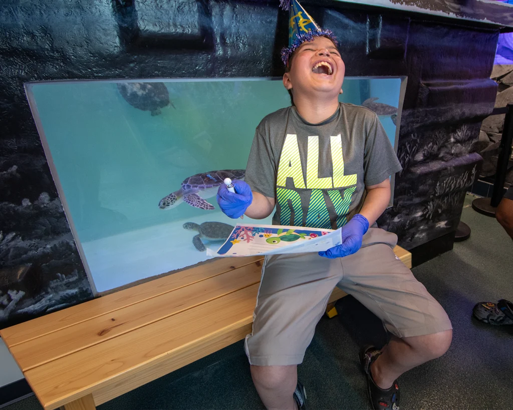 Celebrate with sea turtles in a reserved party space that includes a guided tour of our hospital and residents, a fun interactive game or craft, a themed photo op station, and party favors featuring a Sea Turtle Inc. sticker and coloring sheet – perfect for ocean-loving guests.